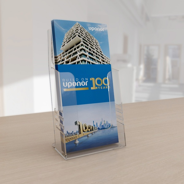 Универсальный держатель буклетов. Может располагаться на столе или крепится к стене. Изготовлен методом литья под давлением.